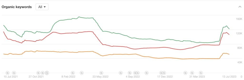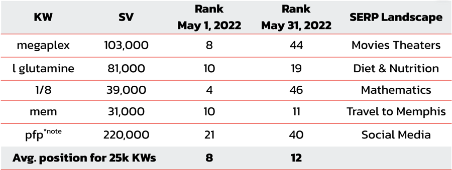 Meanwhile, in 2022, here’s a company that ranked for a bunch of terms that shifted dramatically due to new search intent — captured in Google’s Algo update.